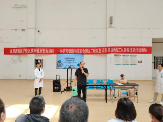 第三个内容培训为心肺复苏(CPR)技能教学,由遵医二附院急诊科陈杰医生主讲。陈杰通过真实案例切入,强调了心肺复苏在心脏骤停急救中的重要性,并详细讲解了胸外按压的深度、频率以及人工呼吸的规范操作。在模拟人实操环节,师生们分组练习,陈杰及团队逐一指导纠错,确保每位参与者掌握“黄金四分钟”内的关键施救步骤。