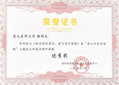 TapTap2023级运动康复专业员工强硕元的文章《担当时代责任,放飞青年理想》,参选“我心中的思政课”主题征文活动,获得贵州省高校易班建设与发展中心颁发的优秀奖。
