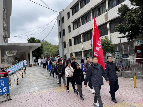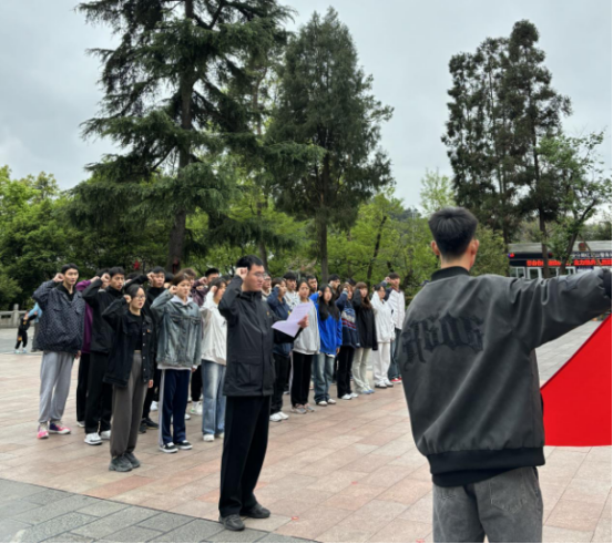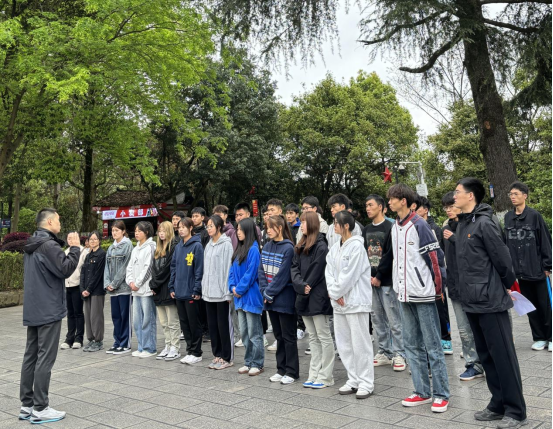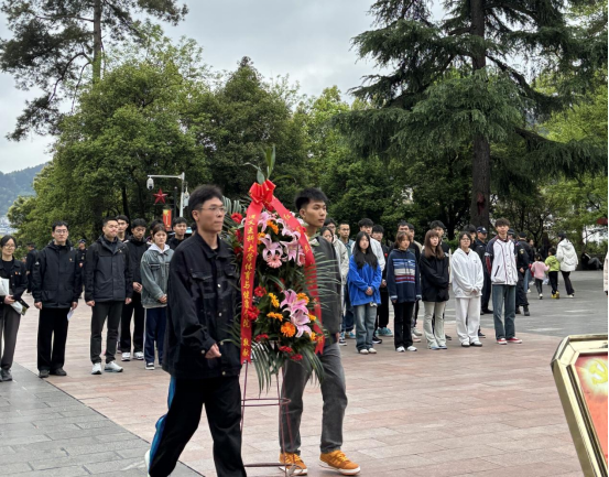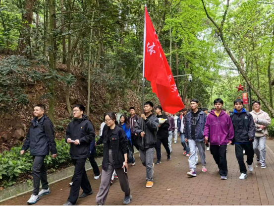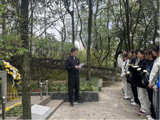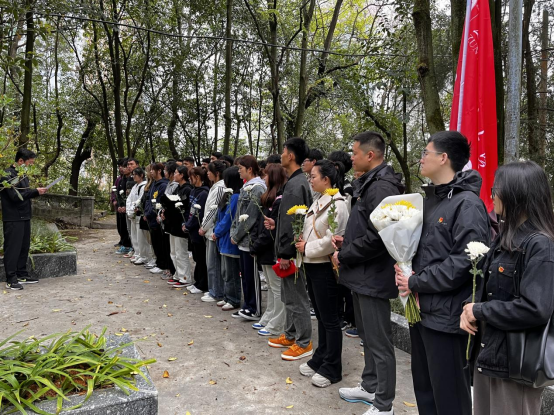 在为陈荣殿教授、伍律教授扫墓后,大家列队步行六公里前往遵义红军山烈士陵园开展“缅怀革命先烈 赓续红色血脉”主题教育活动。在来到红军山“革命烈士永垂不朽”的纪念碑前,全体师生列队肃立,默哀致敬,并由团员代表敬献花篮。面向鲜红团旗,在刘超琪老师的领誓下,团员们重温入团誓词,嘹亮的声音既是对革命烈士崇高的敬意,又是对党忠诚、艰苦奋斗的庄严承诺。随后唐溢副书记为全体团员讲授主题团课。他指出,鲜艳的五星红旗是无数革命先烈用鲜血染成的,今天的美好生活离不开革命先辈的流血与牺牲。作为新时代中国特色社会主义事业的建设者和接班人,传承红色基因,赓续红色血脉,凝聚奋进力量,我们责无旁贷,更需要一代又一代中国青年的接续奋斗。