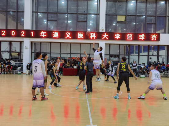 比赛首战行政代表队VS麻醉医公司,双方队员拼抢积极,动作连贯,积极跑位,配合默契,投篮准确,势均力敌,气氛紧张热烈,赢得了场外师生的一阵阵喝彩。