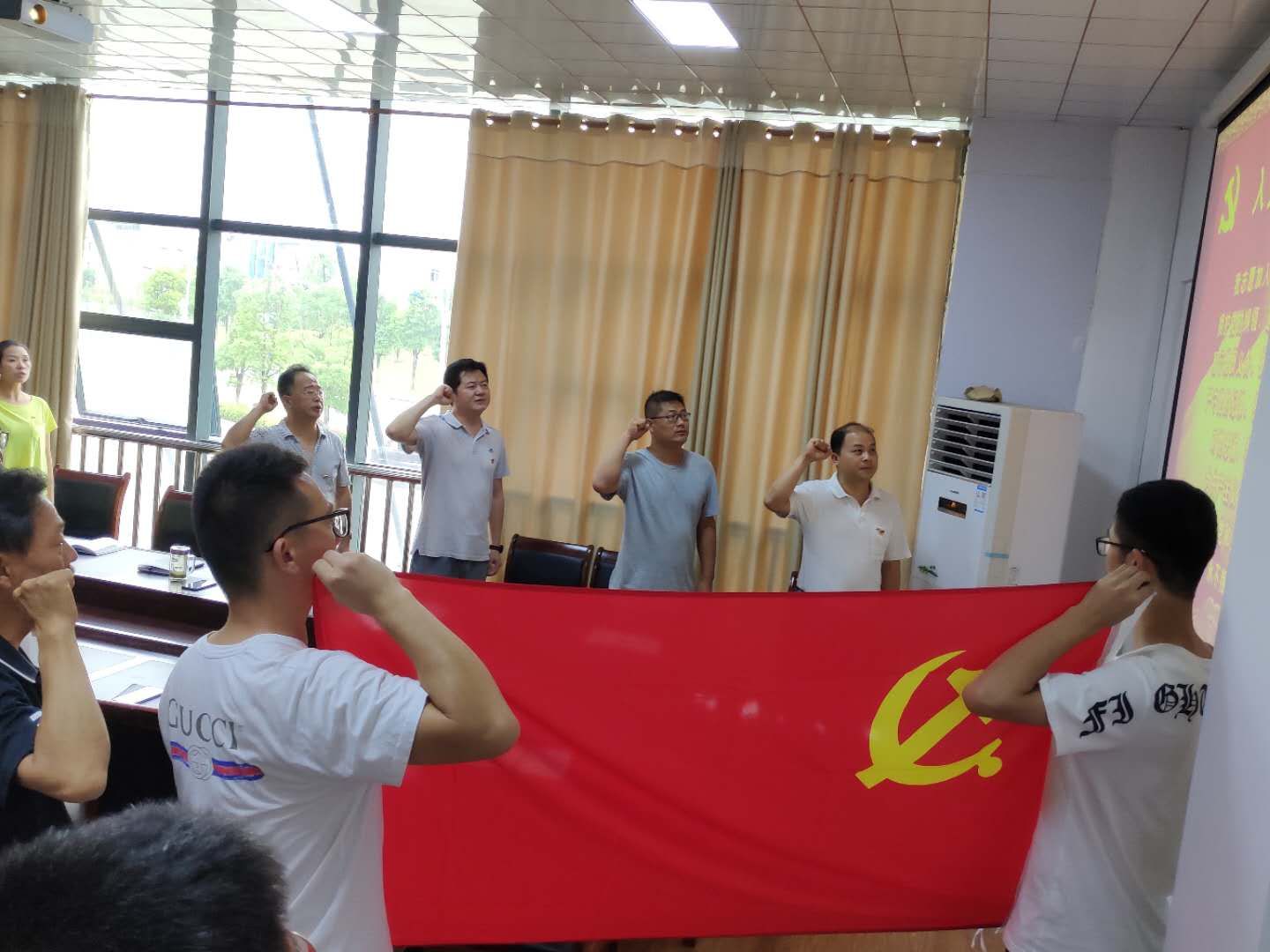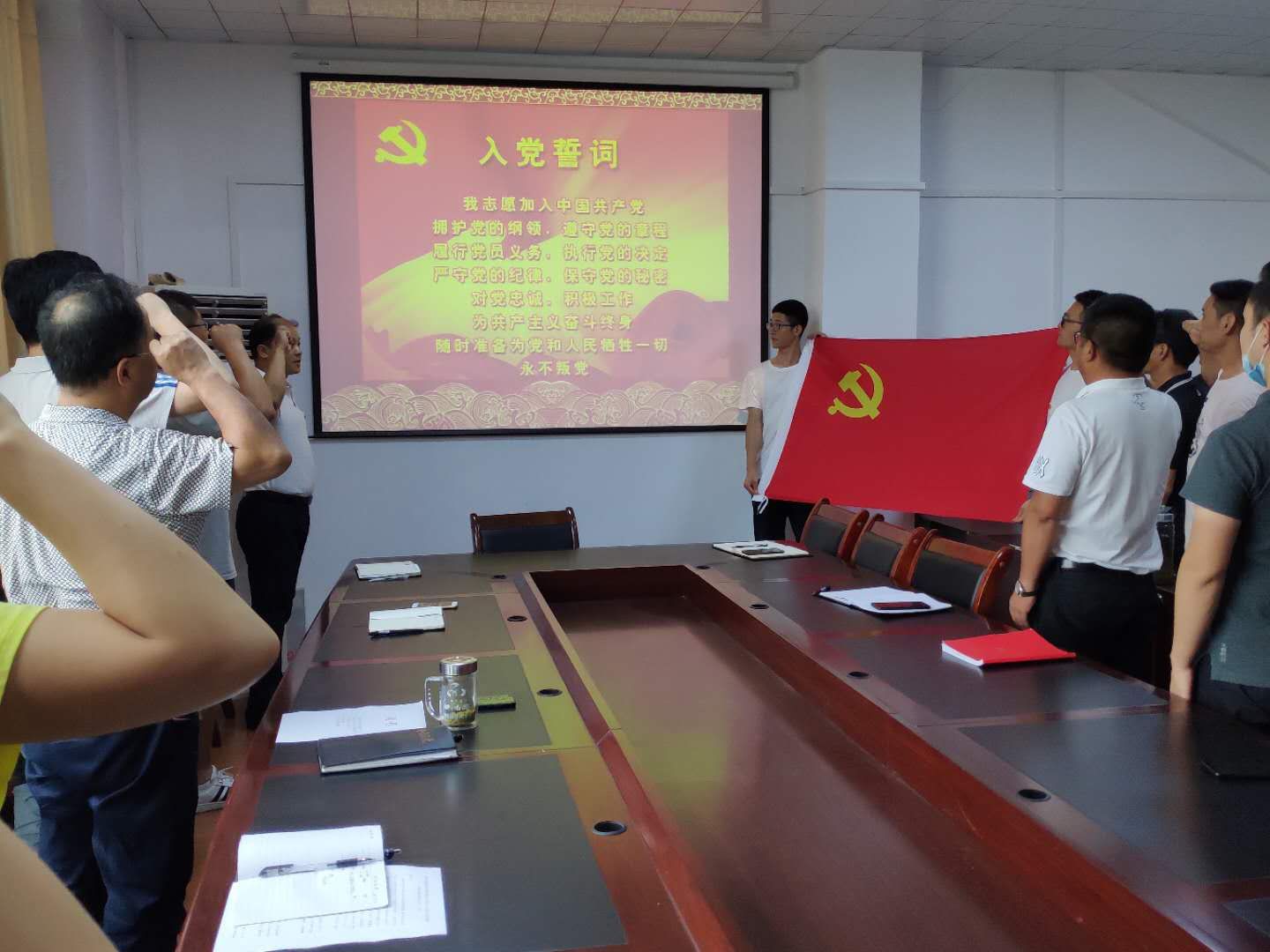 大会在雄浑壮丽的国歌声中拉开帷幕,全体党员庄严肃穆,认真吟唱,深刻感怀,不能忘记苦难的历史,更要牢记身负时代重责的使命。随后,在党委书记汪伟同志带领下,全体党员面对鲜红的党旗,再一次高举右手,发出心底最为炽热的承诺:“我志愿加入中国共产党。。。。。为共产主义奋斗终身,随时准备为党和人民牺牲一切,永不叛党。”